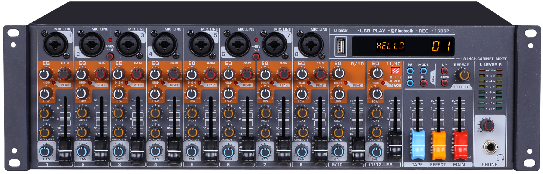 8通道單聲道輸入,(XLR平衡輸入)+2路立體聲輸入一共12通道